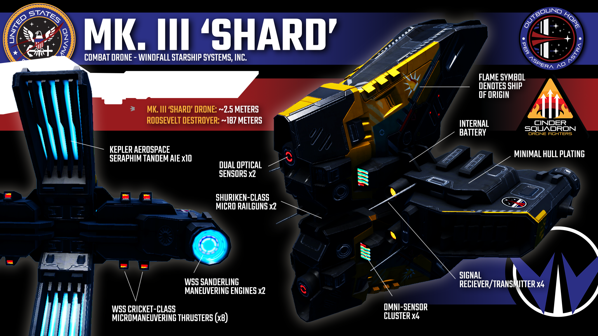 In the 2190’s, as most Roosevelt destroyers were beginning to be retired, the Flame was given another series of technological upgrades and began to be utilized as a transport for covert operations. Its drone suite was significantly upgraded, allowing for a complement of remote fighters. Working with the US Orbital Marines, a full barracks was added to the ship’s lower levels, assisting a series of black ops missions that have only recently been declassified. Their engagements included everything from undermining the growth of the Grayson Rebellion to countering attacks by the Guardians of the Gates of Heaven. Most recently, two pairs of Hachiman perimeter defense cannons were added to the Flame’s already impressive armament, greatly improving the vessel’s ability to repel enemy attacks.